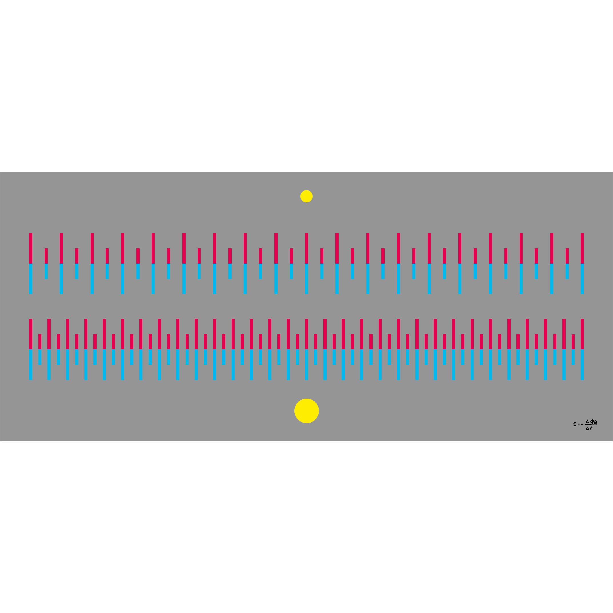 Le figure rosse-blu rappresentano un magnete. Quelle di maggior lunghezza visualizzano l’aumento della forza magnetica; quelle di minor lunghezza visualizzano la diminuzione della forza magnetica. La fila delle linee rosso-blu poste nella parte superiore del quadro visualizzano una lenta variazione della forza magnetica; La fila delle linee rosso-blu poste nella parte inferiore del quadro visualizzano una veloce variazione della forza magnetica.